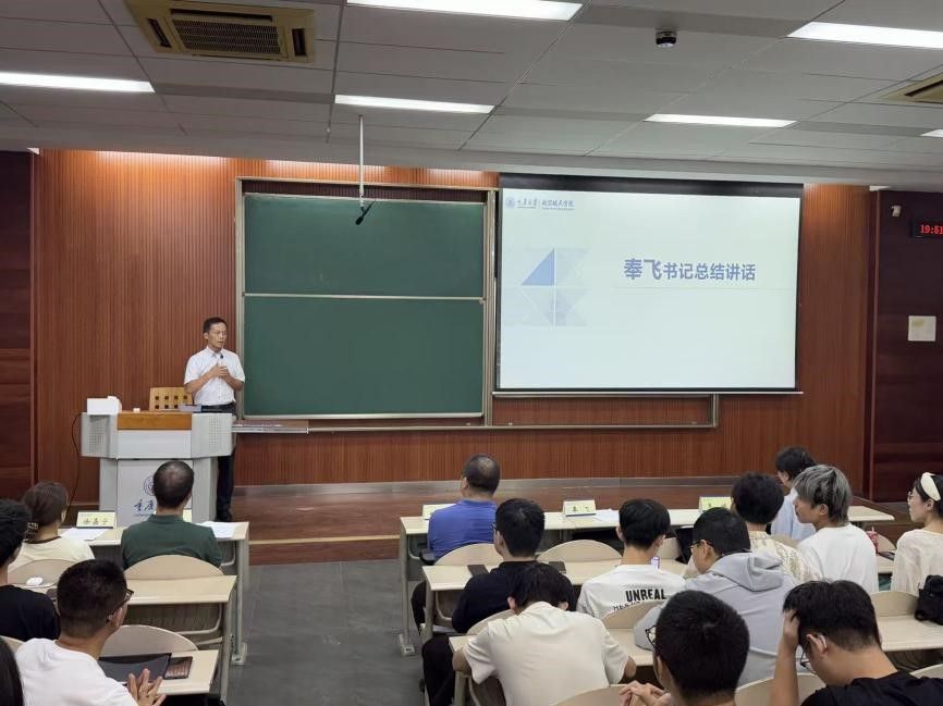 最后党委书记奉飞为大会作总结讲话。奉飞首先对新生们的加入表示热烈欢迎,同时强调,新时代的大学生要争做到学习好、身体好、心态好。希望同学们牢记初心,勇担时代重任,将个人成长与国家发展紧密相连,在大学四年里努力拼搏,实现自己的人生价值,奉飞表示,五楼自拍