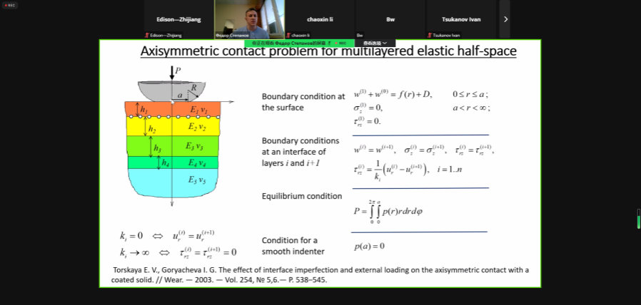 Fedor Stepanov的报告建立并求解了双层弹性半空间与任意形状光滑压头的接触问题。根据压痕曲线确定弹性模量的反问题的解决方案,以及与纳米压头制造商合作获得的实验数据,确定弹性模量新的理论和实验方法的发展。弹性压痕是一种提供此类数据的非破坏性方法,可用于表征摩擦过程中形成的摩擦层的特性。