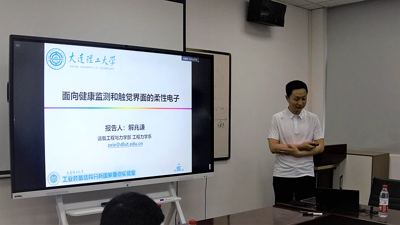 对解兆谦教授的到来表示热烈欢迎,并对报告人作了简要介绍。解兆谦现任大连理工大学工程力学系教授,入选国家级青年人才项目,获辽宁省优秀科技工作者、大连市杰出青年科技人才等荣誉。其研究工作聚焦于柔性电子结构/器件的创新性力学设计、理论方法创新及其在生命健康等领域的应用,已发表SCI论文100余篇,其中以第一、通讯作者在Nature(1篇)、Science(2篇)、Nature/Science子刊(12篇)等高影响期刊发表论文40余篇。多次受到Nature、Science、ScienceDaily、US news、CNN、中国日报网、新华网等专业期刊及媒体的报道。