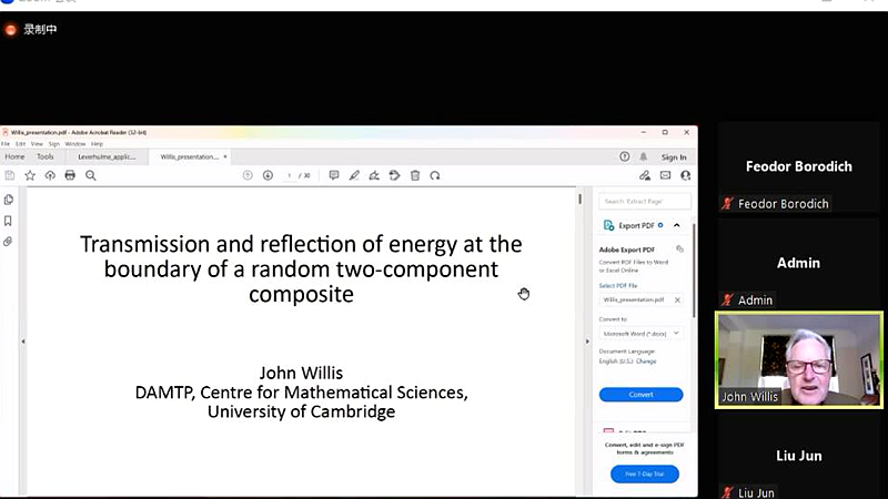 “力学交叉融合”全球前沿学科系列讲座第8期、第9期分别于线上召开。讲座先后邀请英国皇家工程院院士Steve Bull教授开展了主题为“Viscoelasticity and Hyperelasticity in Thin Organic Semiconductor Coatings”的学术讲座和英国皇家学会院士John R. Willis教授开展了主题为“Energy Transmission and Reflection at the Boundary of a Composite with Random Microgeometry”的学术讲座。