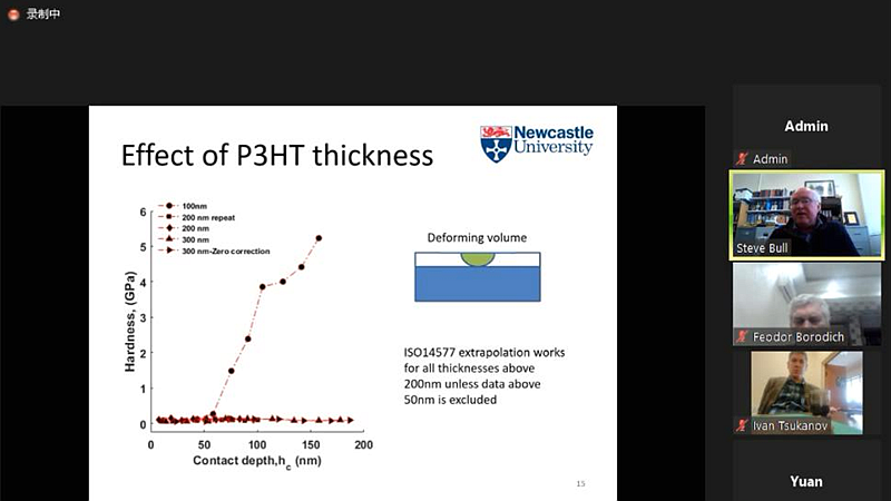 针对有机半导体薄膜应变和时间相关力学特性评估,Steve Bull教授着重介绍了在玻璃基板上使用纳米压痕法对100-300nm涂层样品开展的相关实验研究。针对能量在五楼自拍边界上的传递过程,John R. Willis教授着重讲解如何计算传入五楼自拍的平均能流和从边界反射的平均能流。