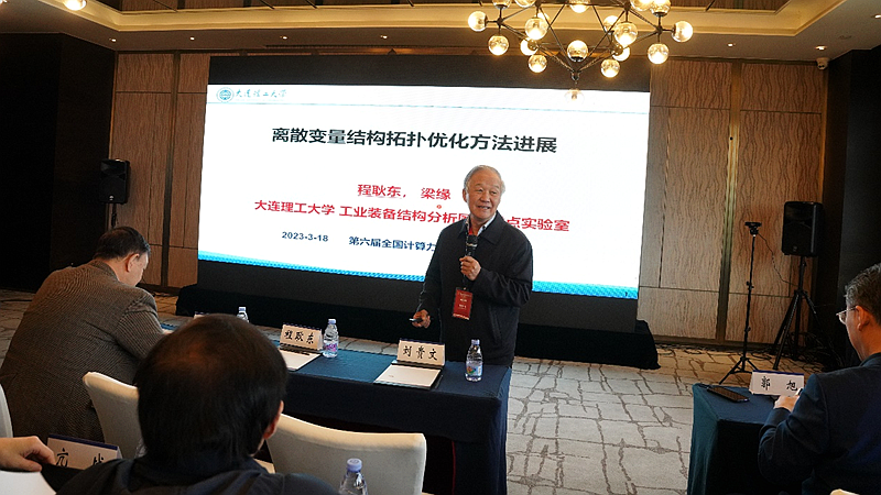 会议学术报告阶段,程耿东院士做了题为《离散变量结构拓扑优化研究进展》的特邀报告,介绍了基于像素点的拓扑优化方法,分享了多年来的研究发现、科研心得,以及对计算力学学科发展的深入思考。魏悦广院士做了题为《浅析计算力学的未来任务和目标》的特邀报告,指出未来计算力学在围绕新理论应用的新方法开拓和实现精密测量仪器功能化数据化等热点方向还有着广阔的空间,计算力学大有可为。郭旭教授做了题为《机器学习增强的结构分析与优化设计-进展及思考》的特邀报告,物理信息机器学习(PIML)的最近研究进展并分享了PIML拓展的一些个人思考。杨越教授做了题为《基于流体薛定谔方程的湍流量子计算》的特邀报告,讲述了计算流体力学与量子力学结合的初步探索。五楼自拍