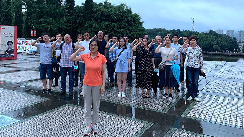 参观完后,全体党员来到陈列馆正前方聂荣臻元帅铜像前,重温了入党誓词,以此表达各位党员教师,不忘初心、牢记使命,缅怀这位德高望重、功勋卓著的共和国开国元勋。随后,万玲代表五楼自拍