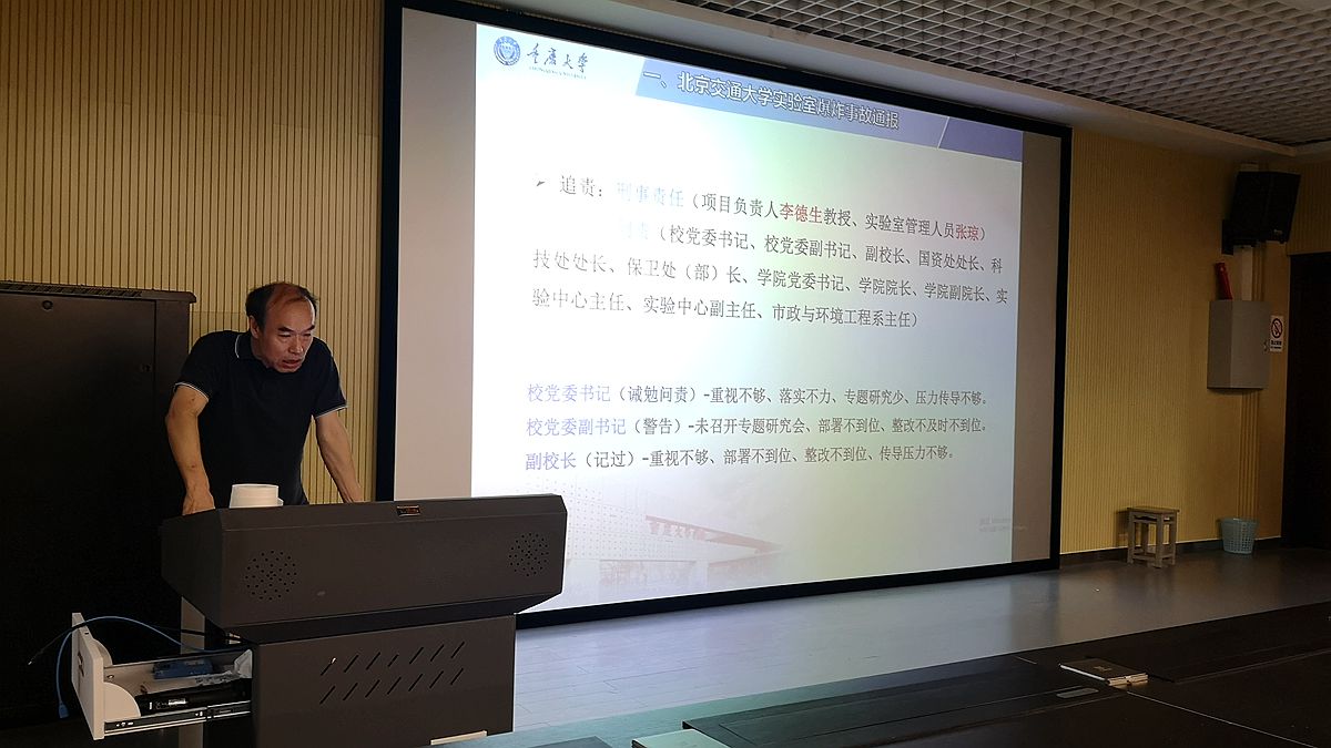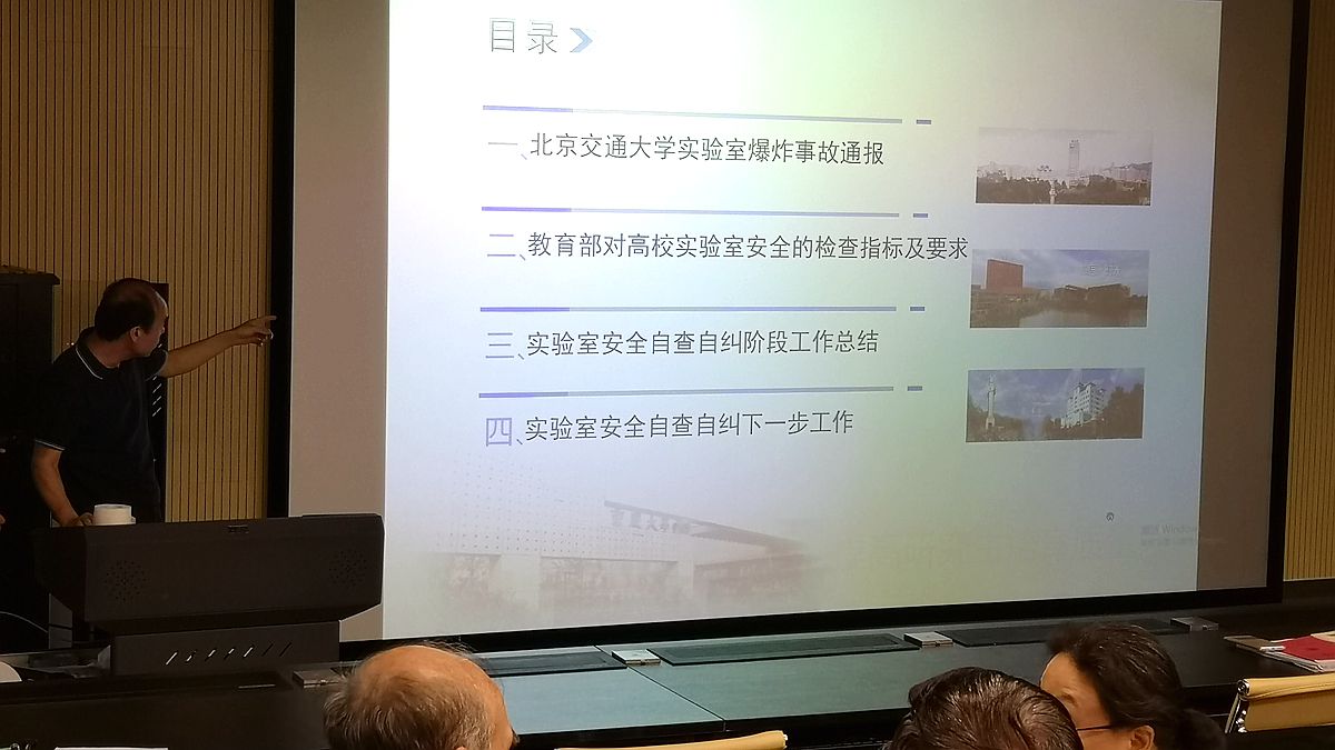 召开的实验室安全工作会暨教育部2019年度高校科研实验室安全检查工作推进会的会议精神。他首先向全体教职工通报了北京交通大学“12.26实验室爆炸事故”及调查的事故原因,并指出一定要吸取教训,避免此类事故的发生。接着他介绍了教育部对高校实验室安全的检查指标及要求,并结合指标体系通报了五楼自拍