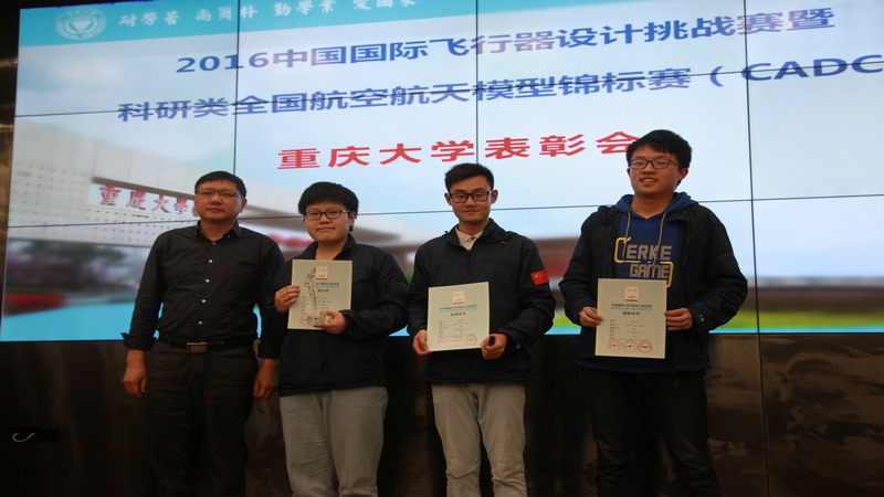 注:中国国际飞行器设计挑战赛(CADC)与美国国际航空设计大赛(SAE)、欧洲大学生载重飞机挑战赛(ACD)并称为大学生飞行器设计类比赛的三大赛事。该赛事结合国家重点科研任务,通过参赛选手自行制作航空航天模型进行缩比验证飞行,进一步拓展高校学生的科技创新能力,为航空工业和国防建设发掘后备人才。本次大赛共设八大项目,我校参加了对地侦察、垂直起降载运及科技创新三个项目,并在垂直起降载运、科技创新项目中,共派出3组队员,3组学生全部获奖。