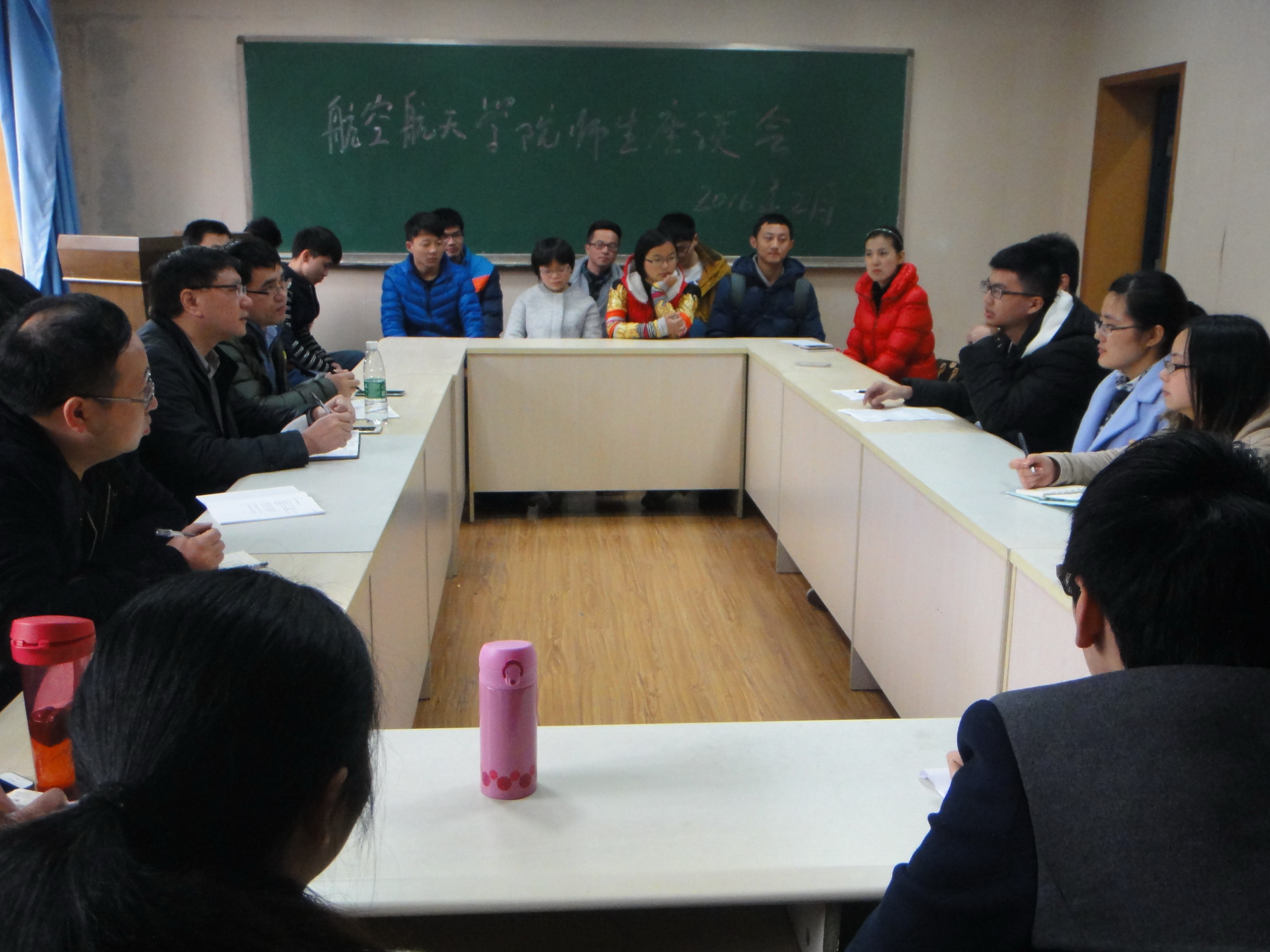 于2月25日下午一点在A7201力学会议室召开本科教学师生座谈会,副院长严波教授、院长助理魏榛教授、院长助理程乐老师、力学系主任蹇开林教授、副系主任张晓敏教授、基础力学系系主任杨昌棋教授,航空航天工程系副系主任姚建尧研究员、学办主任李相林老师、辅导员伍丹老师、本科教务秘书陈洪等相关老师和五楼自拍
