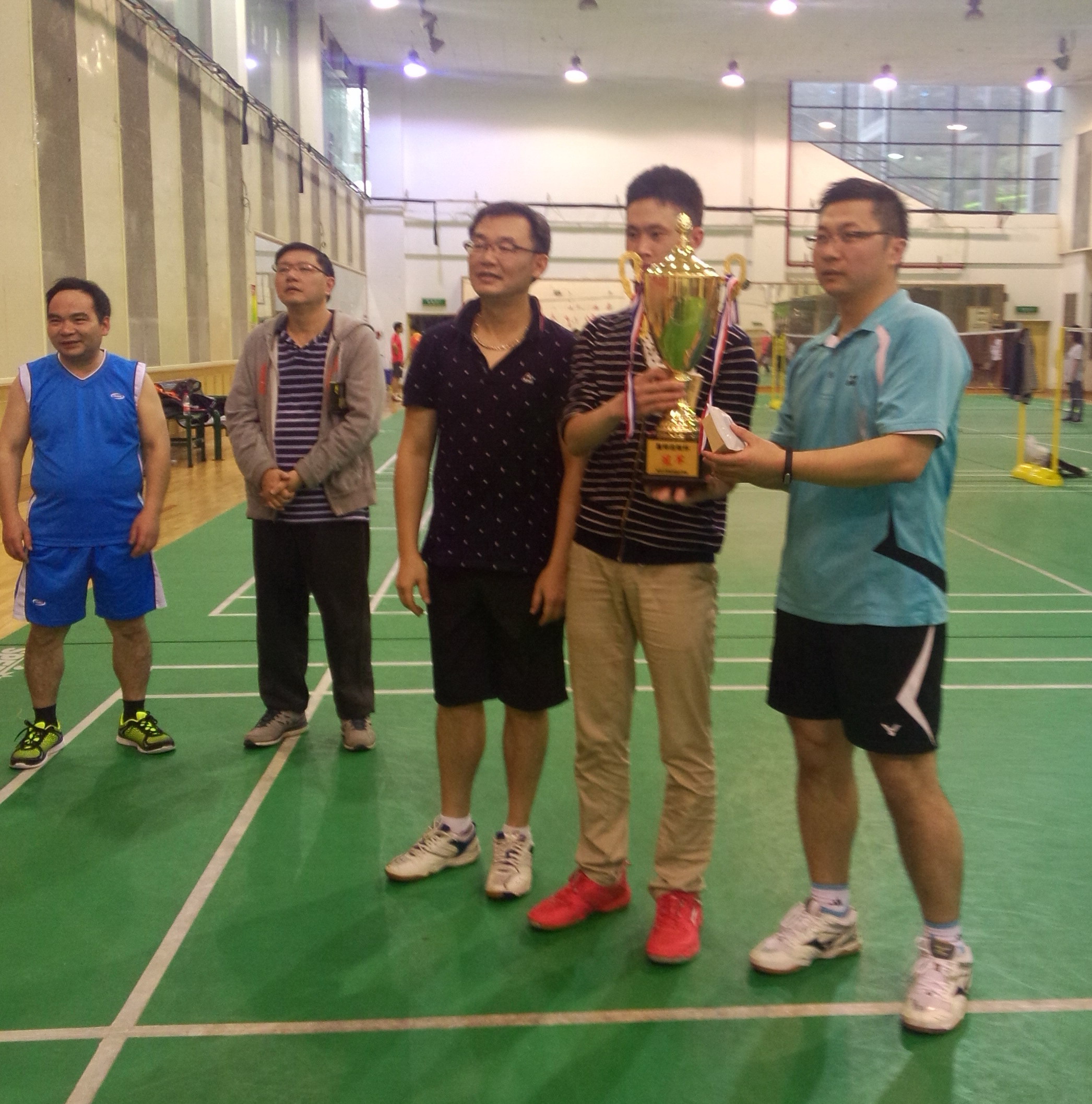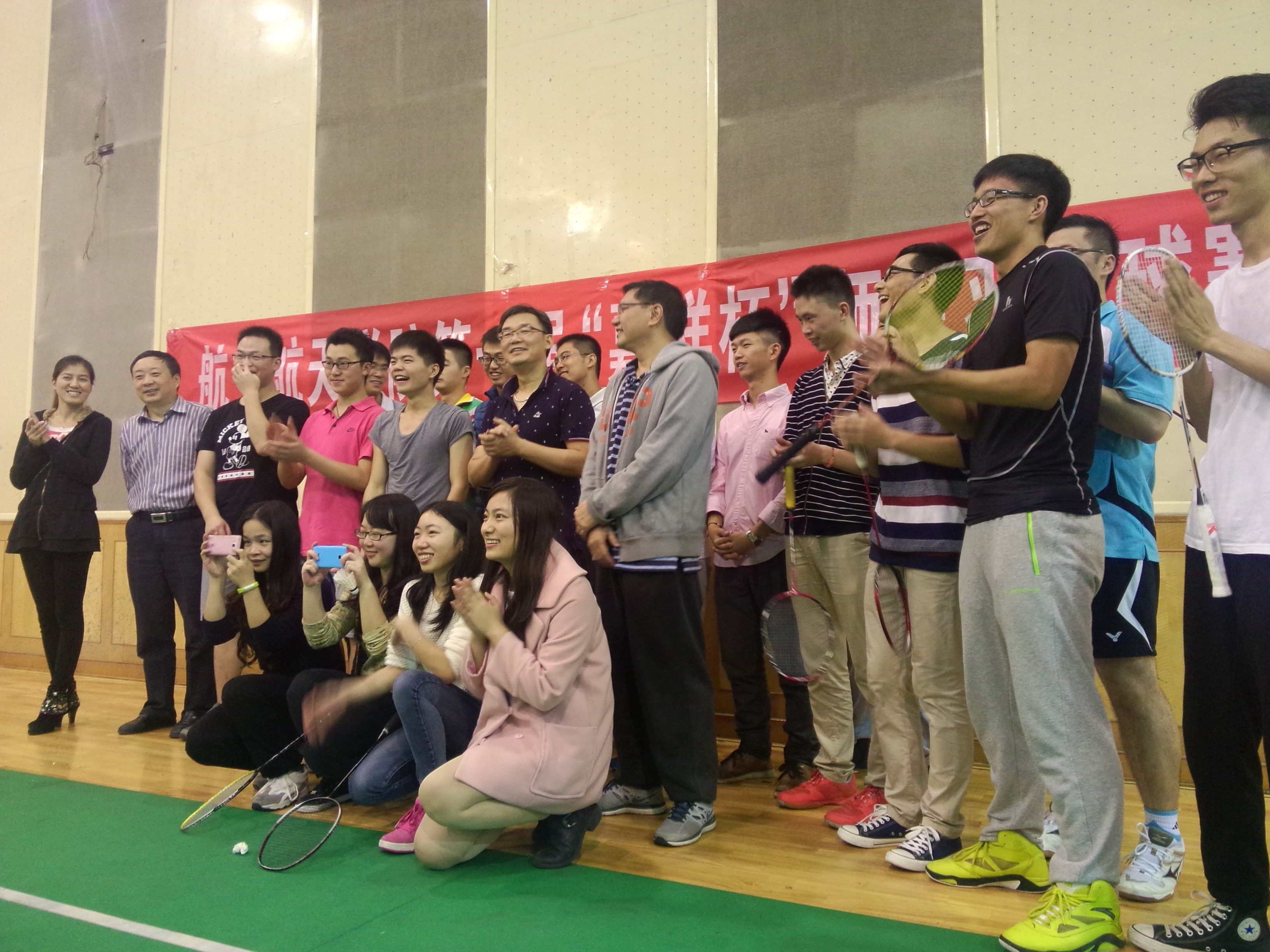 最后老师队与研究生队进行了颁发奖品并合影,工会主席蹇开林教授说:希望以后多举行几次这样的比赛,加强师生间联系。本次羽毛球赛同时为本院老师和学生提供了展示自我、相互切磋的平台,同时提高了同学、老师间的团结协作与交流沟通能力,增强了同学的身体素质,更展现了航空人勇于拼搏的精神。