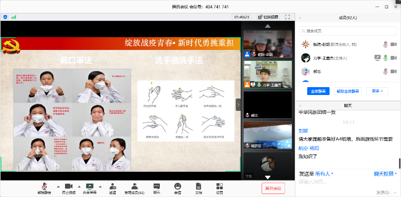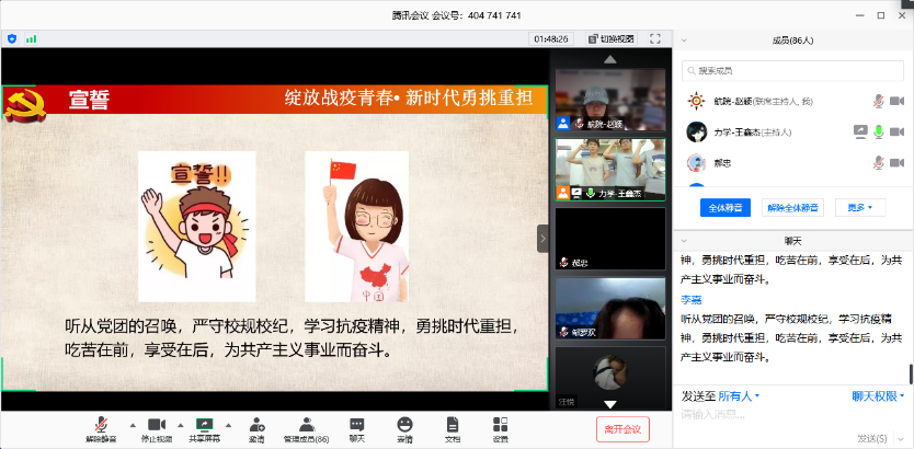 为了号召我校研究生向抗疫奉献者学习,五楼自拍 于2020年5月31日18:00-20:00在腾讯会议APP上举办了以“绽放战疫青春•新时代勇挑重担”为主题的研究生党团活动。