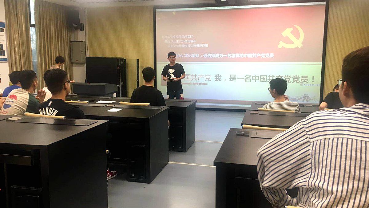 随后。院党委副书记程乐将毕业生党员分成3组进行讨论教育,会议以“不忘初心,牢记使命”为主线,提出了四个问题:什么是共产党员的初心?为什么要坚持牢记初心?我们应该怎么做?我们应选择成为一名怎样的中国共产党员?以此为主要内容开展了学习讨论。通过回顾2019年4月30日召开的五四会议追溯了五四运动发生的背景条件,强调了五四精神“爱国、进步、民主、科学”,程乐副书记并以此解答了第一个问题:中国共产党的初心就是为中国人民谋幸福、为中华民族谋复兴。随后,程乐副书记引入了南昌大学王国炎的反面例子来警示毕业生党员走入工作岗位后要坚持牢记初心,并对习总书记在五四会议上的讲话进行了梳理。程乐副书记通过播放视频的方式引入北大王麟、航天总体部总师助理马晓兵的正面例子,论证了坚持和创新的重要性。随后程乐副书记给大家每小组五分钟时间讨论自己应当选择成为一名怎样的中国共产党员,大家各抒己见,积极参与讨论,然后每组各选择了一名代表进行了总结。