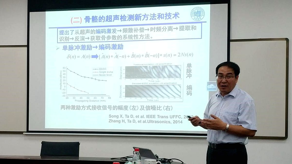 随后,他得安教授介绍了其课题组在超声检测与调控骨骼系统的研究等一系列工作。报告主要分为五个部分:第一部分从研究背景出发,提出了常用诊断方法的缺点,介绍了超声检测的优点,分析了国际上使用的诊断仪器现状及其存在的问题和根源。随后介绍了骨超声检测,从理论上介绍了超声在复杂介质-骨骼系统中的传播。第二部分介绍了骨骼的超声检测新方法和技术,及其面临的主要问题及难点:高衰减、高频散、时频重叠、多模式。提出了从超声编码激发-频散补偿-时频分离-提取和识别-反演-获取骨参数的系统性方法。第三部分介绍了超声诊断新仪器研制及临床数据库建立,提出了现有仪器面临的主要问题:国外所有仪器均采用透射法,分辨率低和测量部位受限。针对频率高、声衰减大、信噪比低的难点,提出了一系列新方法:编码激发、Crazy-climber算法、基于希尔伯特变换-基频估计等。其后,他得安教授分析对比了其课题组研制的新仪器与现有仪器,新仪器具有明显优点:灵敏度高、离散度低等。最后,他得安教授展示了骨超声测试仪实物图。第四部分主要介绍了超声调控大鼠骨质疏松的机制探讨。提出LIPUS调控有效减缓骨质疏松大鼠骨量的流失和骨微结构的退化,是调控骨质疏松症的潜在有效手段;LIPUS调控对骨质疏松大鼠发挥有效作用机制可能在即促进了骨形成过程,同时又抑制了骨吸收过程。第五部分主要介绍了拟开展的研究工作:(1)骨超声诊疗仪的扩展应用;(2)建立人类表型骨骼系统的超声大数据及其分析平台;(3)椎弓根螺钉植入超声引导;(4)跨尺度高分辨率的多模态超声骨成像方法即仪器研制。学术报告持续一个半小时,在场师生踊跃向他得安教授提问并展开了深入的讨论和交流,氛围十分热烈。