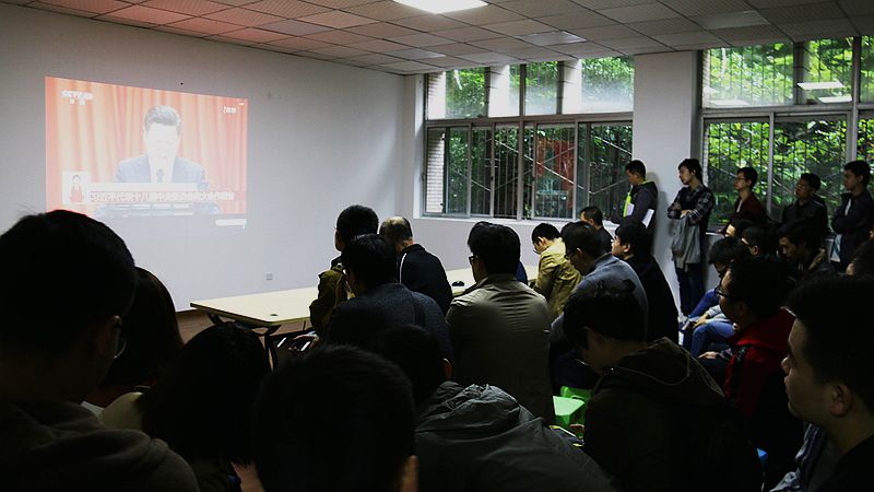 205会议室已经座无虚席。随着国歌响起,师生行注目礼,大家翘首期盼的十九大正式开幕。师生们认真聆听习近平总书记代表十八届中央委员会向大会所作题为《决胜全面建成小康社会 夺取新时代中国特色社会主义伟大胜利》的报告,并不时记录重要内容。
